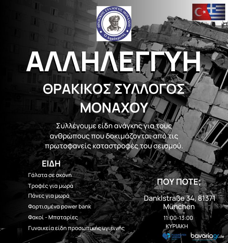 Συγκινητική είναι η ανταπόκριση των Ελλήνων του Μονάχου μετά τον φονικό σεισμό των 7,8 Ρίχτερ κοντά στα σύνορα της Τουρκίας με την Συρία, στο πλαίσιο κοινωνικής προσφοράς και αλληλεγγύης όσους επλήγησαν από τον καταστροφικό σεισμό.